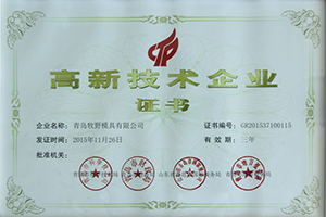 青島牧野模具有限公司獲得青島市科學(xué)技術(shù)局、青島市財(cái)政局、山東省青島市國(guó)家稅務(wù)局、青島市地方稅務(wù)局聯(lián)合頒發(fā)的高新技術(shù)企業(yè)證書;